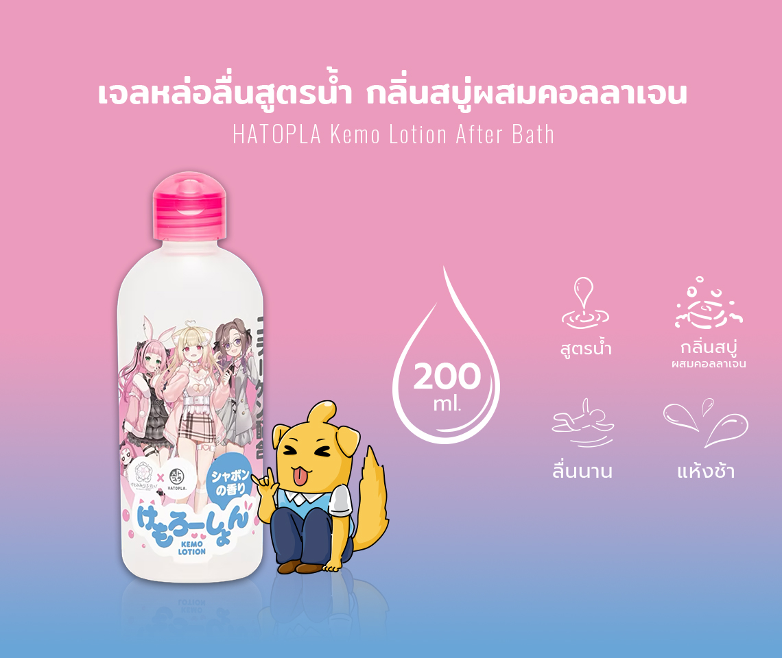เจลหล่อลื่น HATOPLA Kemo Lotion After Bath เจลหล่อลื่นสูตรน้ำ เนื้อเจลนุ่มลื่น กลิ่นสบู่ผสมคอลลาเจน ให้ความชุ่มชื่นสูงได้ความรู้สึกเหมือนน้ำหล่อลื่นตามธรรมชาติ แห้งช้า และล้างออกได้ง่าย ไม่เหนียวเหนอะหนะ ได้รับการทดสอบแล้วว่าไม่แพ้ แม้ผิวที่บอบบางแพ้ง่าย ทำความสะอาดง่าย