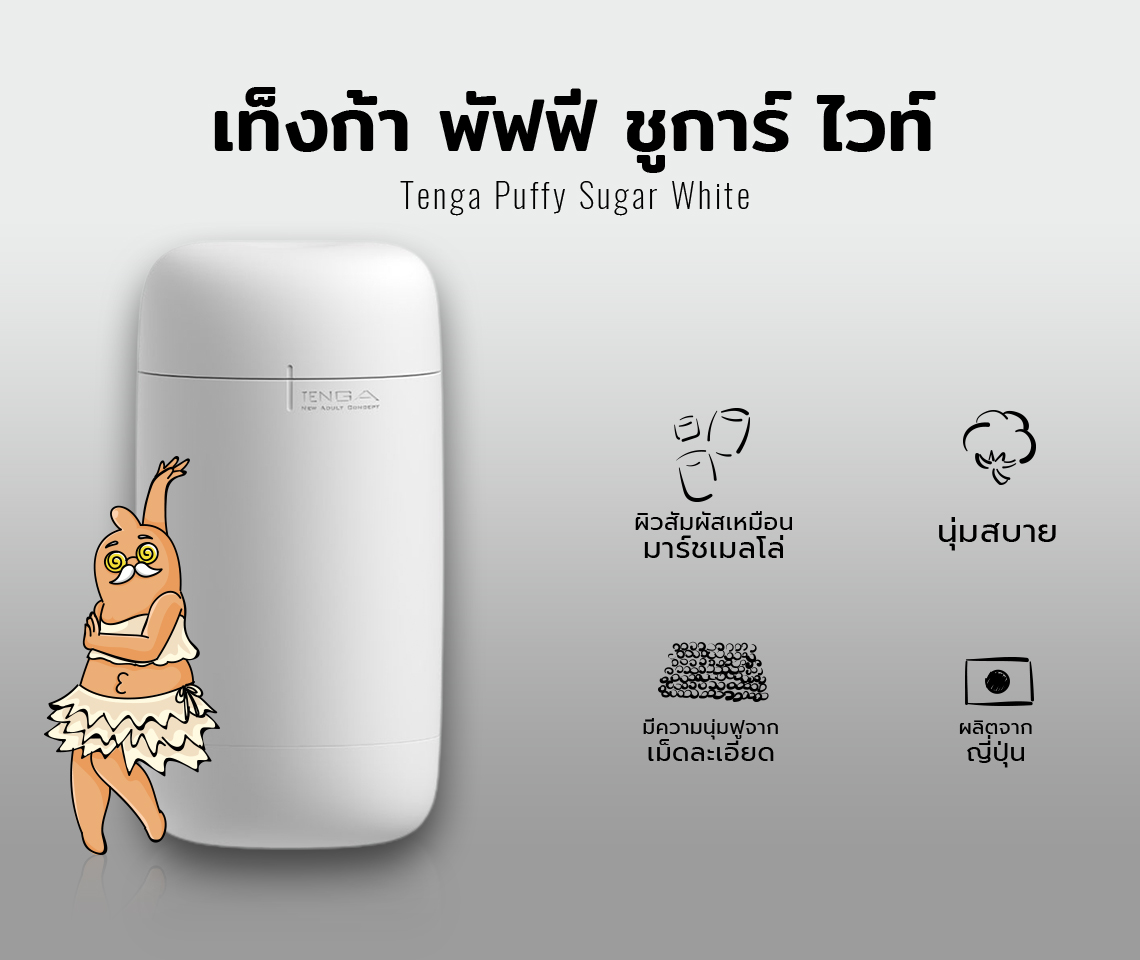 TENGA Puffy Sugar White กระป๋องแห่งความสุขที่มีรูปลักษณ์ทันสมัย มีการออกแบบให้แน่นและกระชับมากขึ้น ไม่ว่าขนาดของคุณจะเล็ก สั้น ใหญ่ ยาว คุณก็สามารถสัมผัสได้ถึงความเสียวที่เพิ่มขึ้นอยู่ต่อเนื่องเมื่อขยับเข้าออก และเมื่อคุณได้ใช้เพียงนิดเดียวคุณจะรู้สึกถึงความแปลกใหม่ทันที โครงสร้างภายในที่แตกต่างกันออกไป รวมทั้งซิลิโคนที่นุ่มกำลังดี ขนาดที่จับอย่างพอดีมือ ทำให้กิจกรรมเข้าจังหวะของคุณรู้สึกดีทุกครั้งที่ได้ใช้ สินค้านำเข้าจากญี่ปุ่น