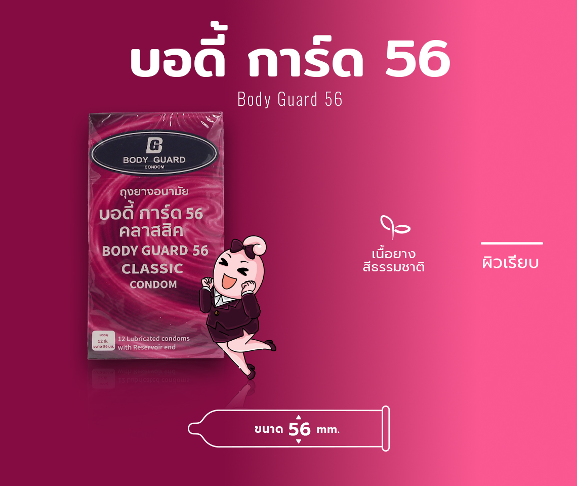 ถุงยางอนามัย Body Guard 56 ถุงยางอนามัย บอดี้ การ์ด ขนาด 56 mm. ความหนา 0.06 mm. เหมาะกับชายไทยที่มีขนาดใหญ่ ทำให้สวมใส่และถอดง่ายขึ้น ลดปัญหาฟิตเกินไป ผลิตจากน้ำยางธรรมชาติคุณภาพสูงตามมาตรฐานสากล ทุกชิ้นผ่านการทดสอบด้วยเครื่องมืออิเล็กทรอนิกส์แล้ว ผลิตตามมาตรฐานสากล ISO 4074:2015 ผ่านการตรวจสอบทุกชิ้น