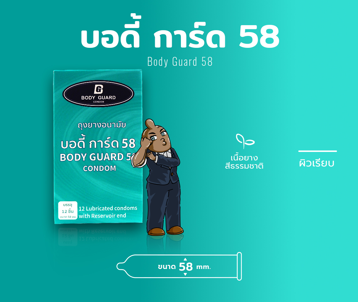 ถุงยางอนามัย Body Guard 58 ถุงยางอนามัย บอดี้ การ์ด ขนาด 58 mm. ความหนา 0.06 mm. เหมาะกับชายไทยที่มีขนาดใหญ่ ทำให้สวมใส่และถอดง่ายขึ้น ลดปัญหาฟิตเกินไป ผลิตจากน้ำยางธรรมชาติคุณภาพสูงตามมาตรฐานสากล ทุกชิ้นผ่านการทดสอบด้วยเครื่องมืออิเล็กทรอนิกส์แล้ว ผลิตตามมาตรฐานสากล ISO 4074:2015 ผ่านการตรวจสอบทุกชิ้น