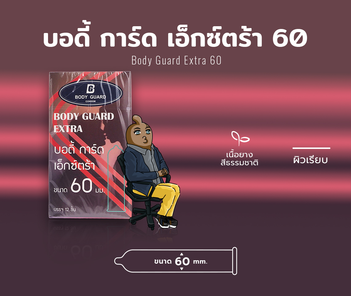 ถุงยางอนามัย Body Guard 60 ถุงยางอนามัย บอดี้ การ์ด ขนาด 60 mm. ความหนา 0.06 mm. เหมาะกับชายไทยที่มีขนาดใหญ่ ทำให้สวมใส่และถอดง่ายขึ้น ลดปัญหาฟิตเกินไป ผลิตจากน้ำยางธรรมชาติคุณภาพสูงตามมาตรฐานสากล ทุกชิ้นผ่านการทดสอบด้วยเครื่องมืออิเล็กทรอนิกส์แล้ว ผลิตตามมาตรฐานสากล ISO 4074:2015 ผ่านการตรวจสอบทุกชิ้น