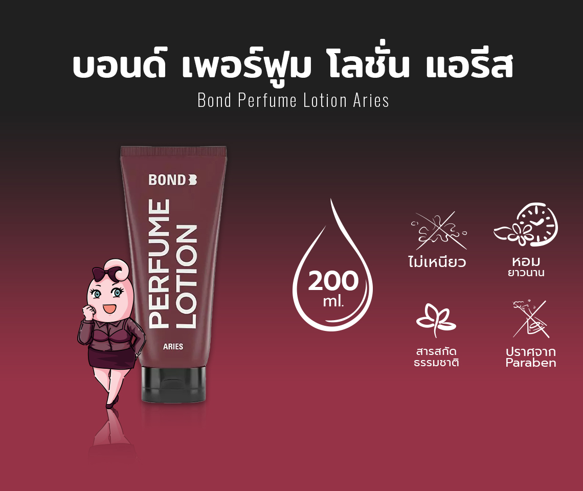 Bond Perfume Lotion Aries โลชั่นน้ำหอมเนื้อบางเบา ซึมไว ไม่เหนียวเหนอะหนะแม้ในวันที่อากาศร้อน พร้อมมอบกลิ่นหอมเย้ายวน เซ็กซี่ ติดผิวยาวนานเช้าจรดเย็น หอมแบบมีเอกลักษณ์ไม่ว่าจะเคลื่อนไหวแบบไหน กลิ่นนี้จะตามคุณไปทุกที่