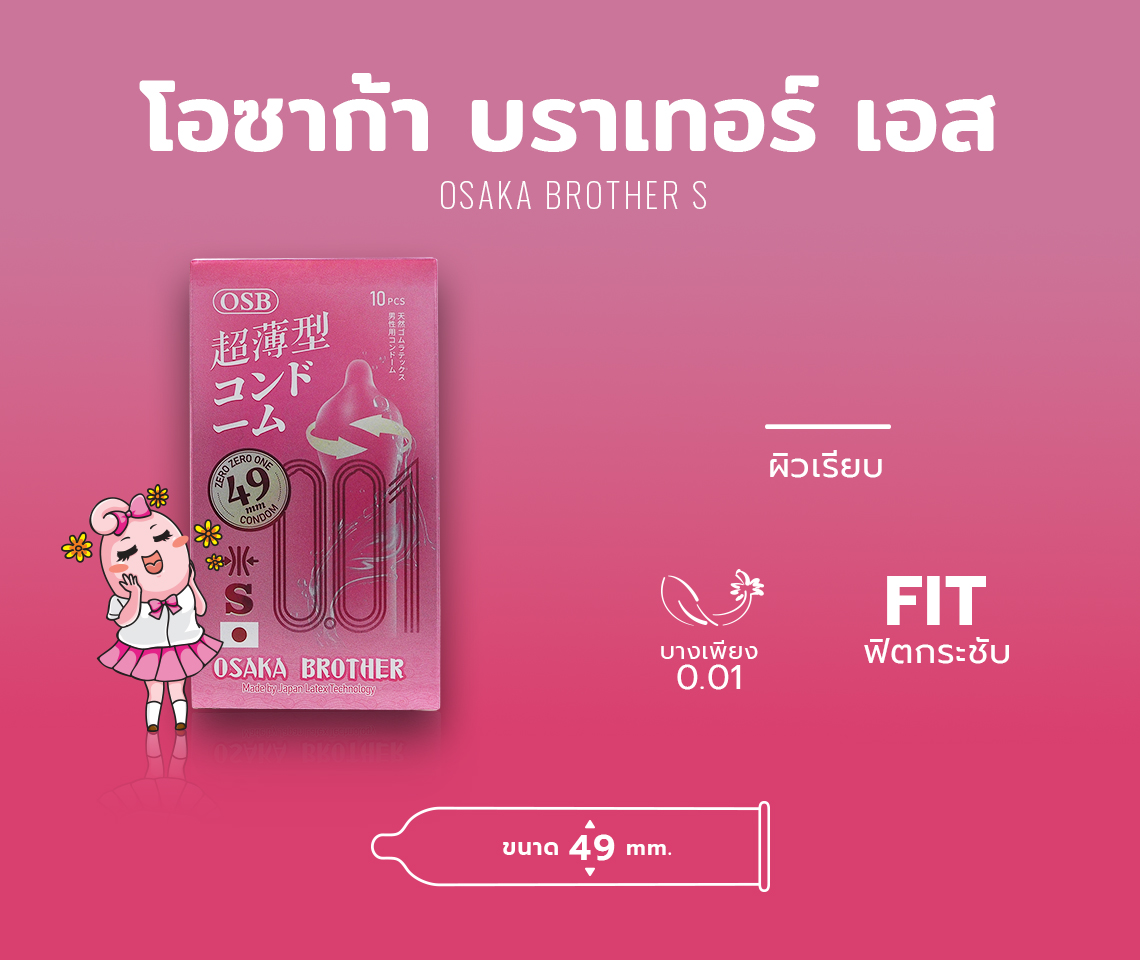 ถุงยางอนามัย OSAKA BROTHER 001 S บางพิเศษ ฟิตกระชับ ผิวเรียบ มีเจลหล่อลื่น 2 เท่า และเป็นเจลพิเศษ ทำให้การสวมใส่นั้นง่ายขึ้น กระบวนการผลิตที่ทันสมัยด้วยเทคโนโลยีจากญี่ปุ่น จึงทำให้ถุงยางอนามัย มีความนุ่ม และยืดหยุ่นขึ้น สวมใส่สบายไม่บีบรัดโคน สารหล่อลื่นทั่วทั้งถุงยางอนามัย