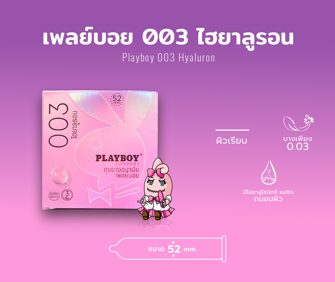 ถุงยางอนามัย Playboy 003 Hyaluron ขนาด 52 มม. บาง 003 มีส่วนผสมไฮยาลูรอน แบบผิวเรียบ ไม่มีกลิ่น มีสารหล่อลื่น จาก ไฮยาลูรอน พิเศษเพื่อความชุ่มชื้นสุดพิเศษ และเป็นการบำรุงอวัยวะให้ชุ่มชื้น ทำจากลาเท็กซ์ หรือ น้ำยางธรรมชาติ ผ่านการทดสอบด้วยเครื่องมืออีเล็กทรอนิกส์ทุกชิ้น ผลิตโดย บริษัท ไทยนิปปอนรับเบอร์อินดัสตรี้ จำกัด (มหาชน) ภายใต้มาตรฐานการผลิต : ISO 4074:2002