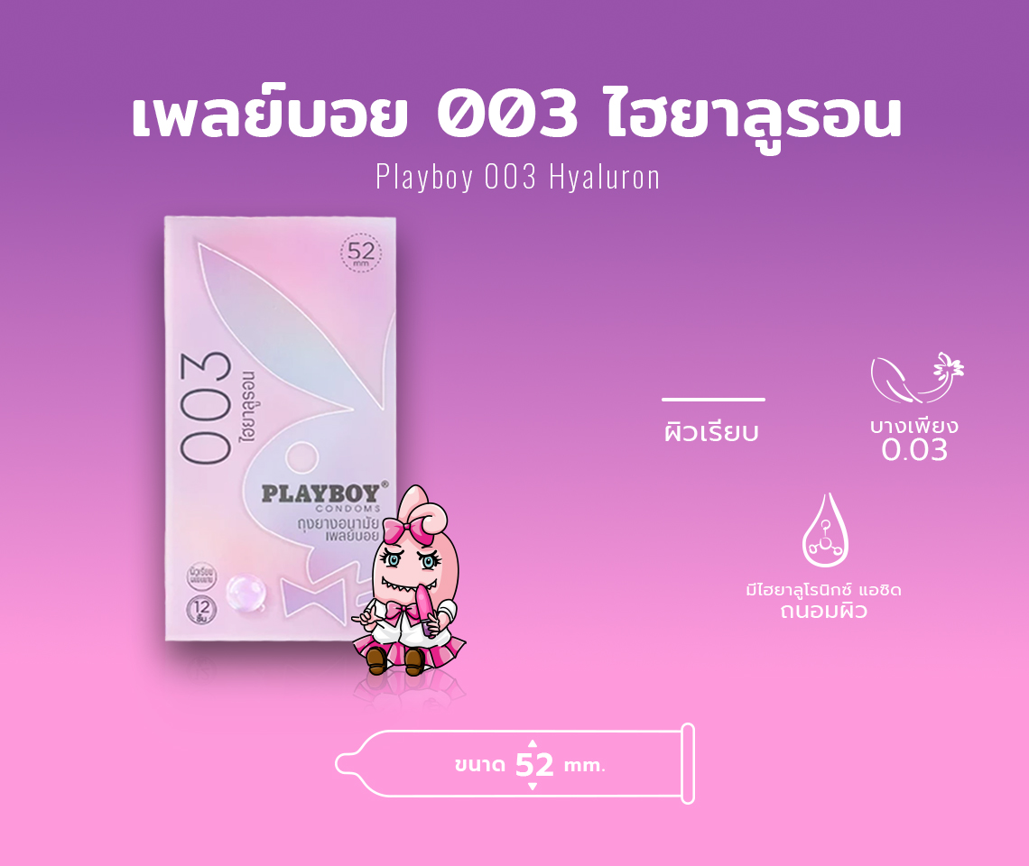 ถุงยางอนามัย Playboy 003 Hyaluron ขนาด 52 มม. บาง 003 มีส่วนผสมไฮยาลูรอน แบบผิวเรียบ ไม่มีกลิ่น มีสารหล่อลื่น จาก ไฮยาลูรอน พิเศษเพื่อความชุ่มชื้นสุดพิเศษ และเป็นการบำรุงอวัยวะให้ชุ่มชื้น ทำจากลาเท็กซ์ หรือ น้ำยางธรรมชาติ ผ่านการทดสอบด้วยเครื่องมืออีเล็กทรอนิกส์ทุกชิ้น ผลิตโดย บริษัท ไทยนิปปอนรับเบอร์อินดัสตรี้ จำกัด (มหาชน) ภายใต้มาตรฐานการผลิต : ISO 4074:2002