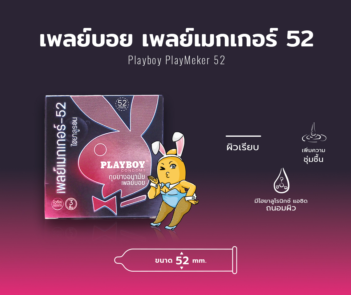 ถุงยางอนามัย Playboy PlayMeker เพลย์เมกเกอร์ 52 ไฮยาลูรอน ขนาด 52 มม. แบบผิวเรียบ ไม่มีกลิ่น มีสารหล่อลื่น จาก ไฮยาลูรอน พิเศษเพื่อความชุ่มชื้นสุดพิเศษ และเป็นการบำรุงอวัยวะให้ชุ่มชื้น ทำจากลาเท็กซ์ หรือ น้ำยางธรรมชาติ ผ่านการทดสอบด้วยเครื่องมืออีเล็กทรอนิกส์ทุกชิ้น ผลิตโดย บริษัท ไทยนิปปอนรับเบอร์อินดัสตรี้ จำกัด (มหาชน) ภายใต้มาตรฐานการผลิต : ISO 4074:2002