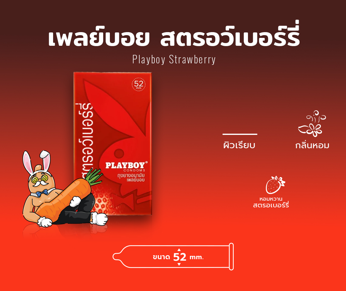 ถุงยางอนามัย Playboy Strawberry สตรอเบอร์รี่ ขนาด 52 มม. เพิ่มกลิ่นสตรอเบอร์รี ผิวเรียบ ผนังขนาน มีกระเปาะ ใส่สารหล่อลื่นมากกว่า 550 mg. ผลิตจากน้ำยางธรรมชาติ มาตรฐานสากล ISO 4074 : 2015 มอก. 625-2559 ใบอนุญาตเครื่องมือแพทย์เลขที่ 68-1-2-2-0000383