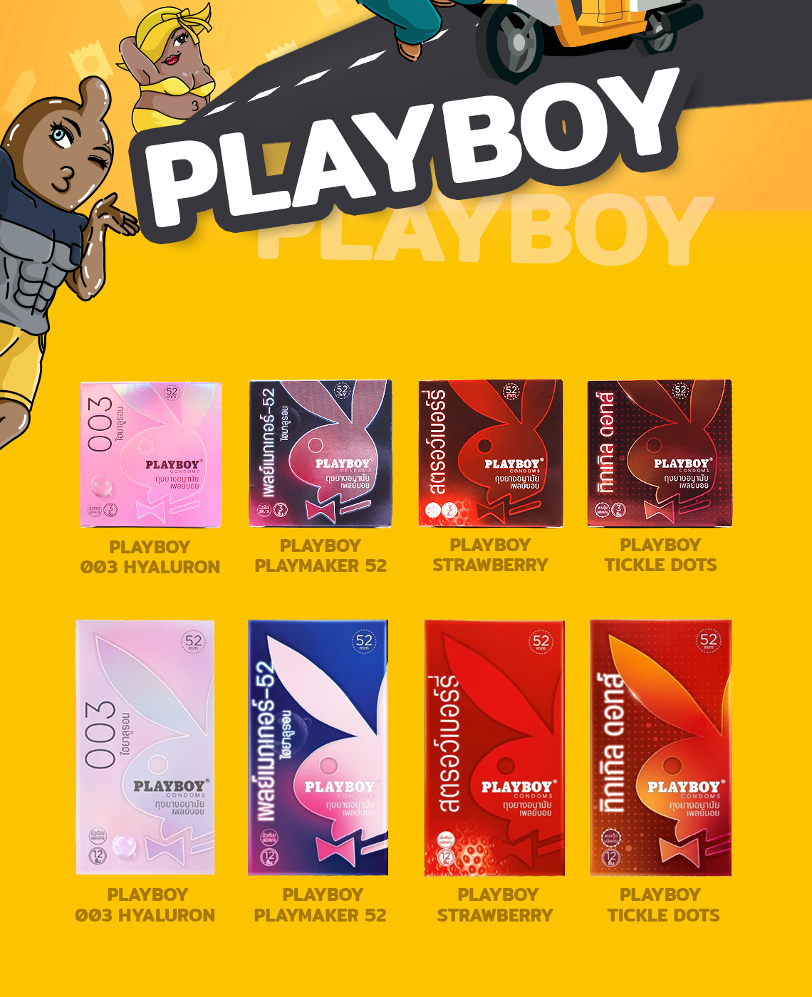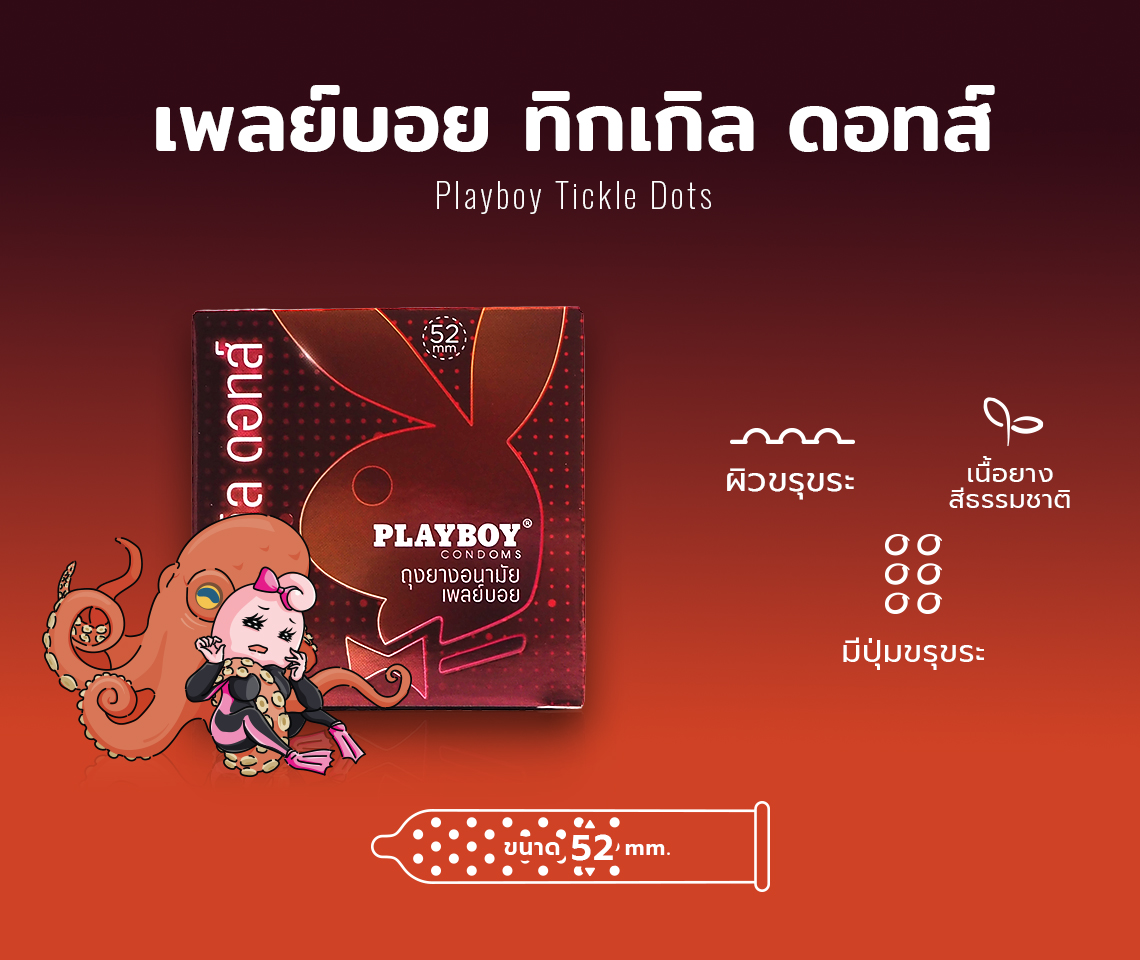 ถุงยางอนามัย Playboy Tickle dot ถุงยางอนามัยผิวไม่เรียบ มีปุ่มขรุขระ ความบาง 0.06 mm. ไม่มีกลิ่น มีสารหล่อลื่นทำจากลาเท็กซ์ หรือ น้ำยางธรรมชาติผ่านการทดสอบด้วยเครื่องมืออีเล็กทรอนิกส์ทุกชิ้น ผลิตโดย บริษัท ไทยนิปปอนรับเบอร์อินดัสเตรี้ จำกัด (มหาชน) ภายใต้มาตรฐานการผลิต : ISO 4074:20151