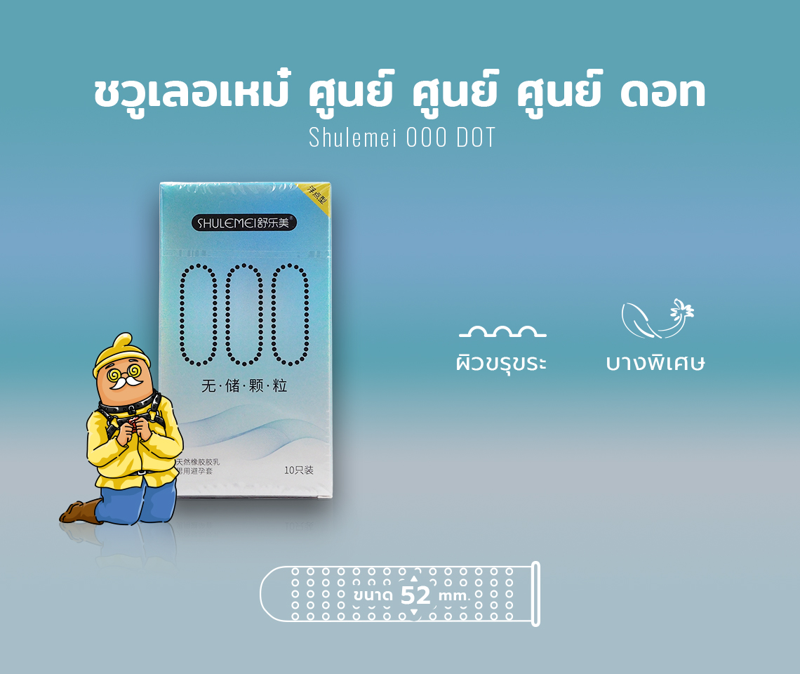 ถุงยางอนามัย Shulemei 000 Dot บางพิเศษ ผิวไม่เรียบ มีเจลหล่อลื่น 2 เท่า และเป็นเจลพิเศษ Hyaluronic Acid สำหรับบำรุง ทำให้สวมใส่ง่าย มีกลิ่นหอมอ่อนๆ ขนาด 52 mm. น้ำยางธรรมชาติ ยางเหนียวนุ่มทำให้รู้สึกเสมือนจริง